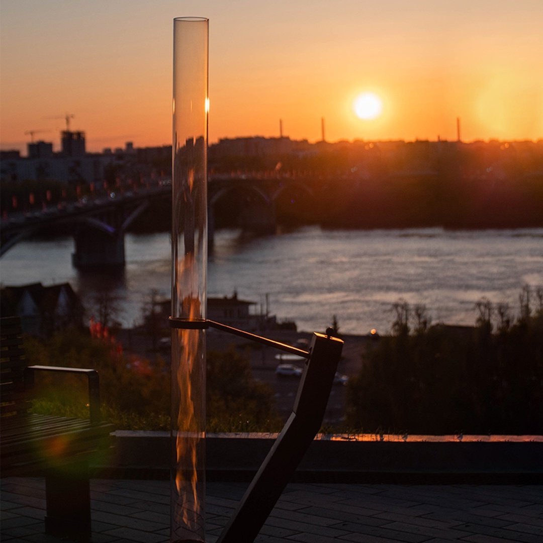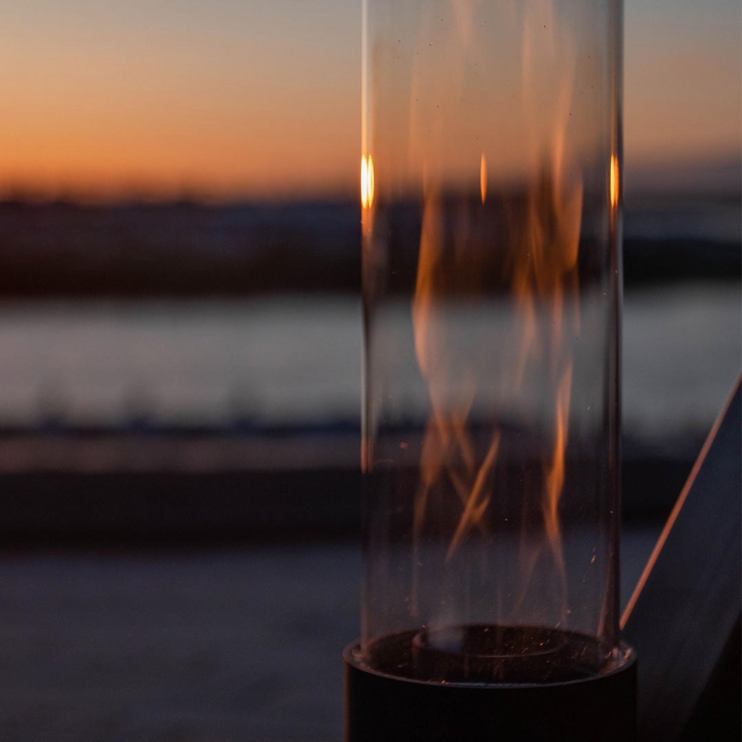 Как это работает: после розжига и установки стеклянной колбы на подставку, огонь силой тяги завихряется и поднимается на высоту трубы. Создается красивый необычный эффект огненного столба, это создает уютную атмосферу, дает возможность безопасно посидеть у живого огня. Кроме этого, биокамин дает тепло и свет, его можно ставить на открытых и закрытых террасах, беседках, у домов и бань. Подходит для круглогодичного использования, зимой рядом с ним довольно тепло. Камин полностью экологичен, не коптит и не дымит, работает на древесных пеллетах.