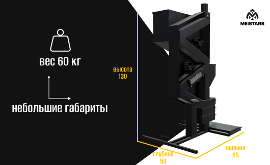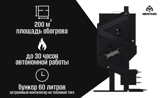 Пеллетный бункер размещен в задней части котла и вмещает 40 кг пеллет. Этого объема вам хватит на 15–30 часов автономной работы, в зависимости от выбора мощности.